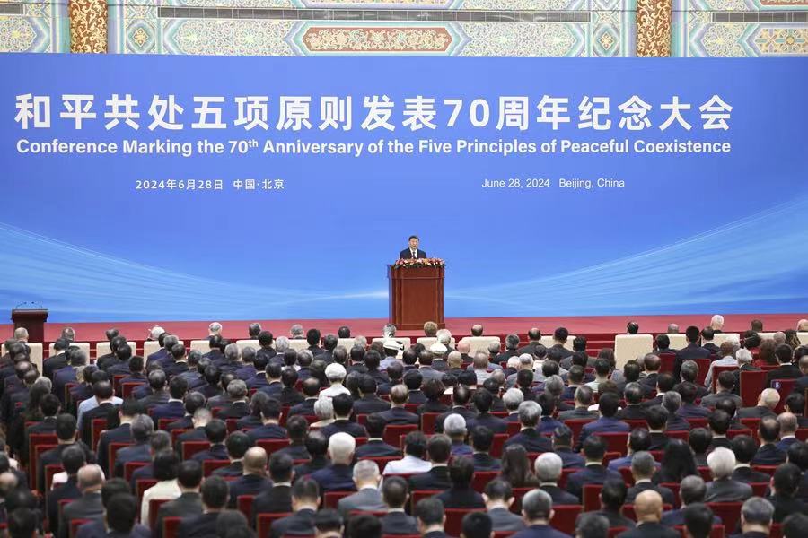 6月28日上午,和平共處五項原則發表70周年紀念大會在北京人民大會堂隆重舉行。國家主席習近平出席紀念大會并發表題為《弘揚和平共處五項原則,攜手構建人類命運共同體》的重要講話。
